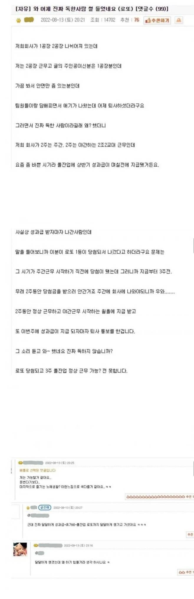 로또 당첨됐는데 성과금까지 다받고 퇴사한 사람