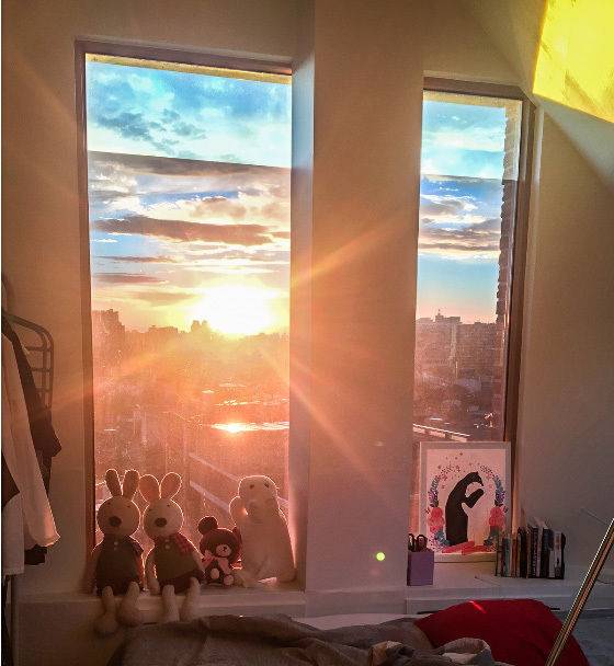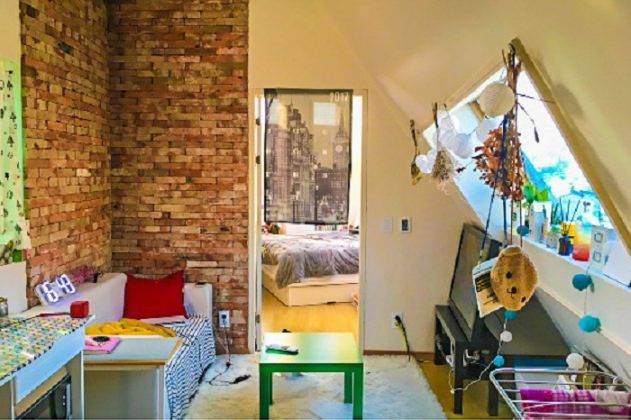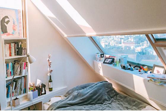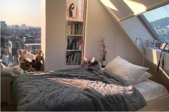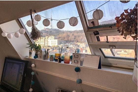 루프탑의 공간이기에 가능한 비스듬하게 떨어지는 지붕에 창하나를 내고 그 옆 벽에 큰 유리창으로 만들어 서양 어느 도시의 집처럼 항상 바깥 풍경을 볼 수 있게 만들었다.