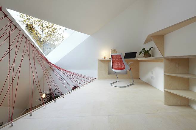 실내 공간이 넓거나 독특한 동선이 심어진 것은 아니다. 하지만 일반 사각형의 주택 주택이 아닌 지붕의 모양을 끼고 있는 루프탑의 독특한 공간 컨셉이 이국적 느낌을 만들어 낸다.