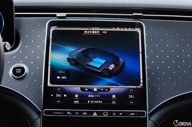 중앙 디스플레이는 12.8" 크기의 세로형 디스플레이를 사용한다. 가로 비율이 약간 큰 덕분에 세로형 디스플레이 탑재 차량들 가운데 시원스럽게 눈에 들어 오는 편이다. 또한 그동안 지속적으로 개선되어 온 MBUX는 터치 인터페이스를 적극 채용하면서 더욱 사용이 편리해졌다. 해상도도 우수하며 반응속도도 충분히 빠른 편이다.
