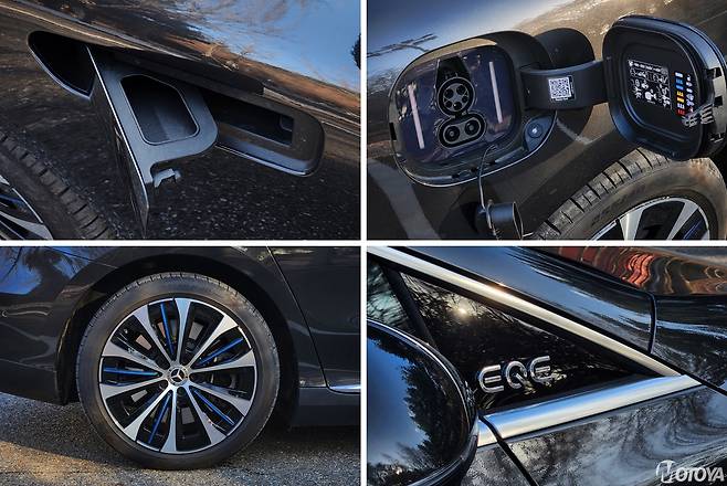 특이사항으로, 보닛은 열리지 않는다. 워셔액을 보충하기 위해서는 운전석측 프론트 펜더에 자리하는 전자개폐식 워셔액 주입구를 열어서 해결한다. 충전기 삽입구는 통상적인 전방엔진 내연기관 자동차의 연료주입구 자리에 위치하며, DC 콤보를 지원한다. 휠은 파란색 장식이 적용된 EQ 모델 전용 디자인의 알로이 휠이 적용된다.