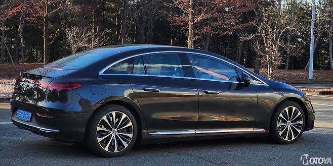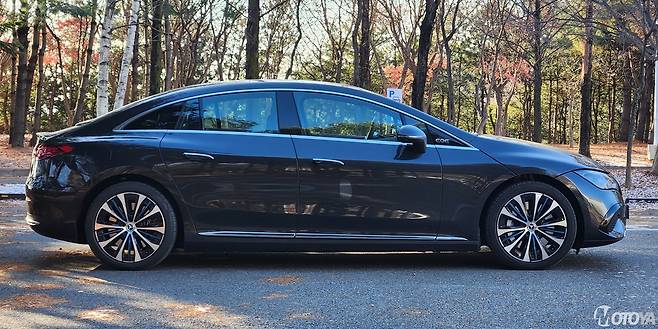 측면에서는 마치 미래의 자동차들에서 나타나는 매끄러운 형상이 인상적이다. EQS에서부터 먼저 특히 매끈한 조약돌처럼 빚어진 차체 디자인은 후드, 캐빈, 트렁크 리드의 경계가 모호하다. 이러한 특징으로 인해 동사의 4도어 쿠페 모델인 CLS보다도 더욱 날렵한 스타일을 지니며, 미래지향적인 감각을 자랑한다.