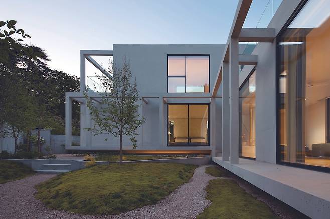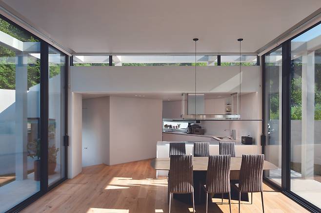 집이 대지 위에 떠 있는 것은 대지에 일상의 공간을 겸손하게 연결하는 하나의 연출이다. 안과 밖을 나누는 경계는 닫아서 막아야 할 당위성과 열어서 이어야 할 필연성 사이에서 모순을 만든다. 해법은 툇마루의 형식으로 경계를 공간화하는 것이다. 정원은 의도된 마당이 아닌, 가운데 앉힌 집으로 나뉜다. 조각난 외부가 됐지만 투명하게 열린 내부와 이어지며 다시 하나가 된다.