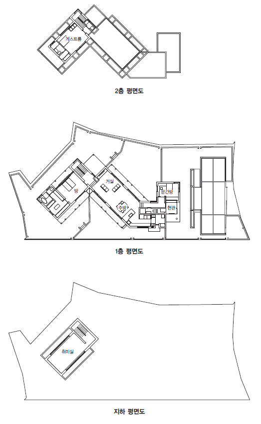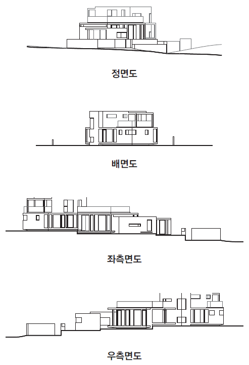 완만하게 비탈을 따라 공간도 오르내리며 크고 작은 영역을 만든다. 길게 늘인 공간은 땅의 높이와 함께 두세 단의 차이를 만들며 이어진다. 극적인 긴장을 조성하기보다 평이하게 이완된 느낌으로 내외부가 하나의 공간으로 감각되기를 의도했다. 기교를 동원한 디테일과 텍스처를 가능한 절제하고 수수하고 순수한 방식을 통해 형태가 아닌 형상이 나타나기를 바랐다.