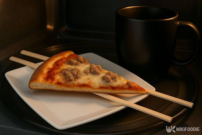 냉동 피자를 전자레인지에 바로 넣으면, 수분이 날아가면서 겉은 딱딱해지고 속은 질척해진다. 이를 막기 위해선 조리 전 머그컵에 물을 약간 담아 함께 전자레인지에 넣는다.