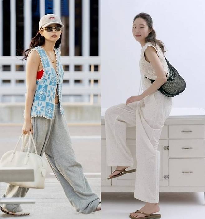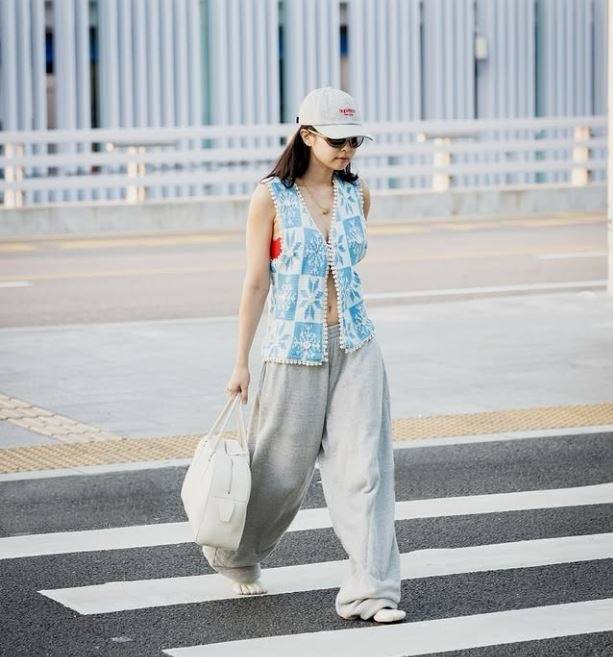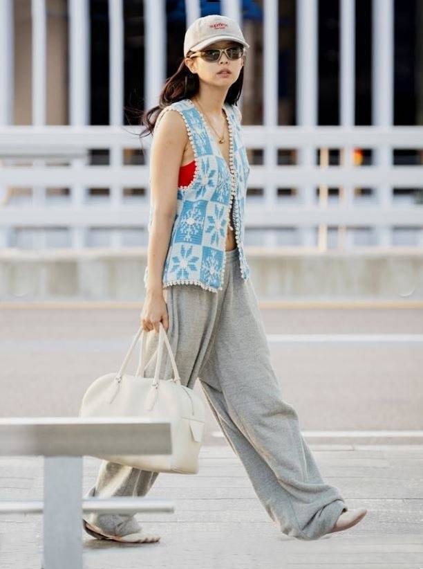 그롭 블랙핑크 제니는 최근 크로셰 니트 베스트와 레드 브라톱, 여기에 루즈한 팬츠를 매치한 쿨한 크로셰 공항패션을 선보였다.
