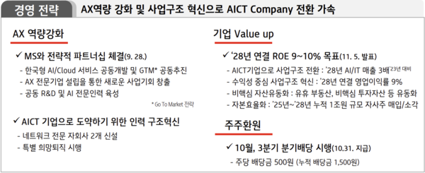 이와 함께 KT는 MS와 AX(AI전환) 전문 기업을 설립 중이다. 이 기업은 KT의 100% 자회사로 설립되며, 출범 뒤 5년 간 매출 목표는 4조6000억원이다. 정찬호 KT IT전략기획담당 상무는 8일 열린 3분기 실적발표 콘퍼런스콜에서 AX전문 기업의 역할에 관해 "고객사들이 업무를 AI로 전환할 때 접근법을 잘 못잡고 있다"며 "어떻게 하면 AI와 클라우드로 전환할 수 있는지 기술적으로 컨설팅할 것"이라고 설명했다.