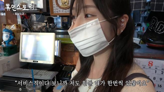 제가 성격도 유쾌하고 활발한 편이긴 한데, 서비스직이다 보니까 저도 힘들 때가 한 번씩 있잖아요. 근데 그런 거를 표출 못하고 일해야 되는 것도 힘들고, 체력이 약간 안 돼서 진짜 힘들어요. 왜냐면 오늘은 예약이 좀 있어서 이모님을 불렀는데, 원래는 엄마랑 저랑 다 굽고 세팅까지 다 하거든요. 그래서 이거보다 훨씬 더 많이 움직여야 돼요.