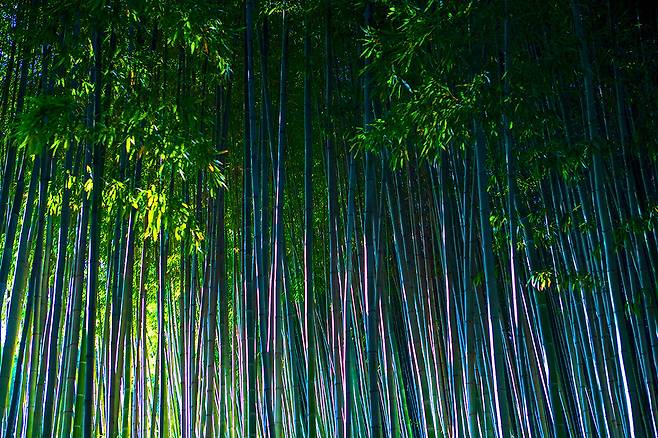 밤하늘 아래 조용히 흔들리는 대나무들의 실루엣은 낮과는 또 다른 감동을 선사한다.