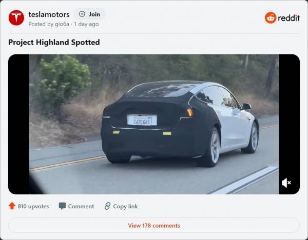 테슬라 모델 3 리프레쉬 스파이샷이 해외에서 포착됐다. 테슬라는 ‘프로젝트 하이랜드(Project Highland)’라는 이름으로 약 1년간 개발을 진행해왔으며, 올 하반기 모델 3 리프레쉬를 출시한다.