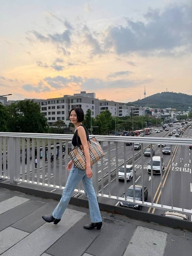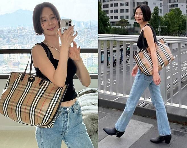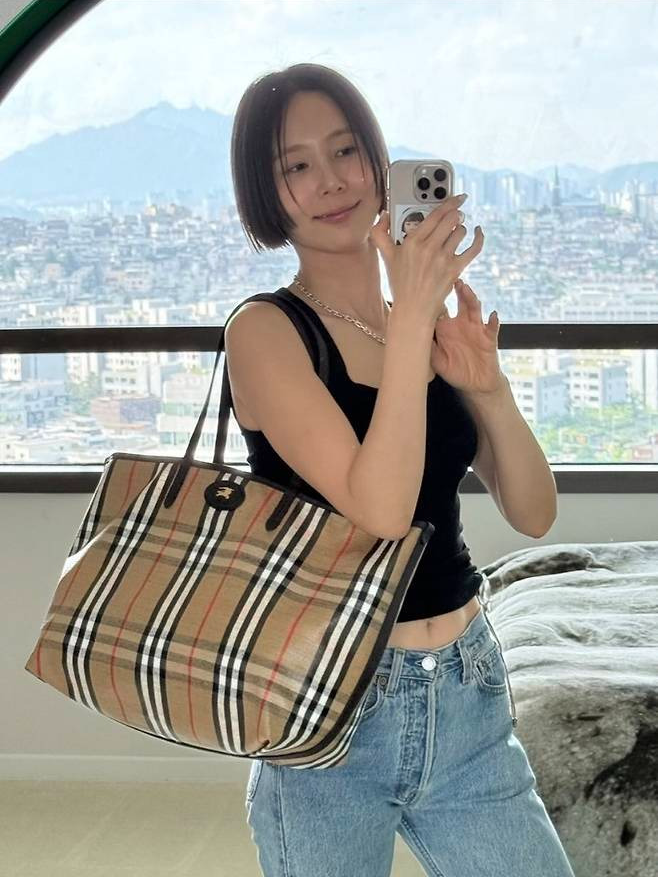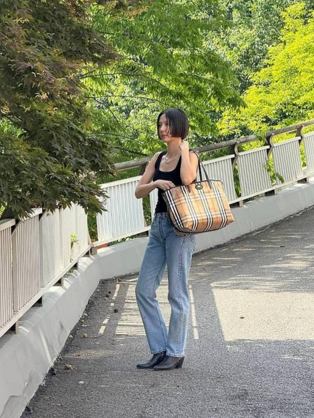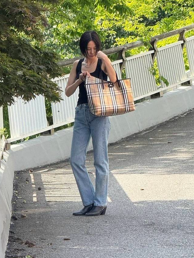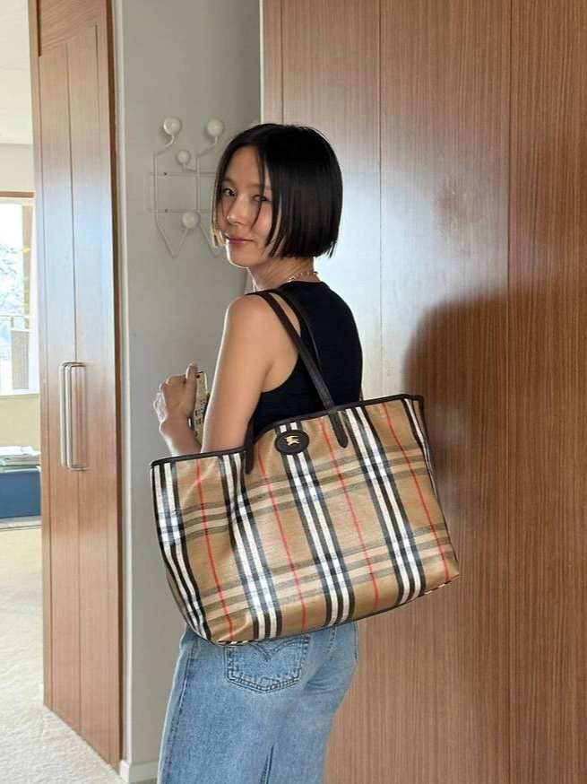 여기에 클래식 체크 패턴이 돋보이는 버버리 빅사이즈 토트백을 더해 고급스러움을 놓치지 않았으며, 블랙 부츠힐로 마무리한 스타일링은 실용적이면서도 시크한 무드를 자아냈습니다.