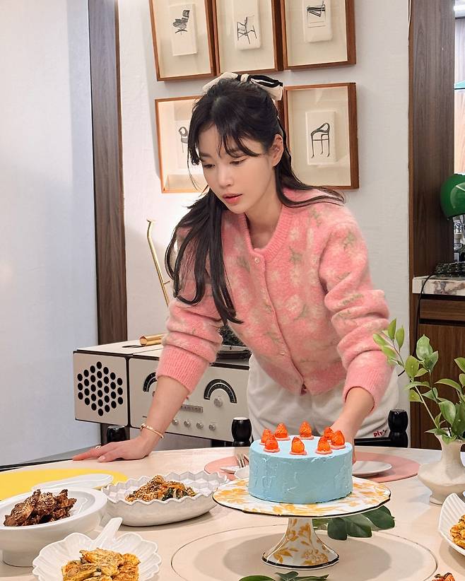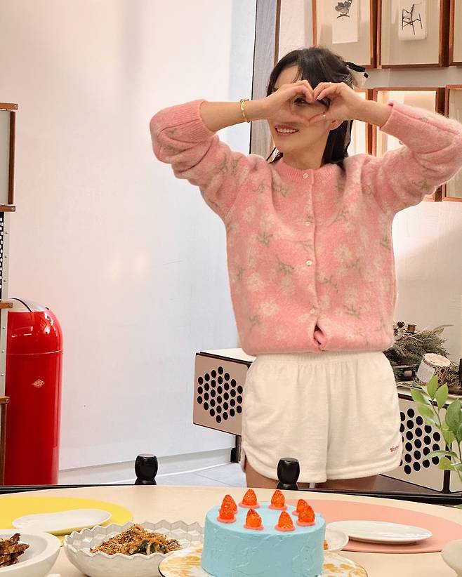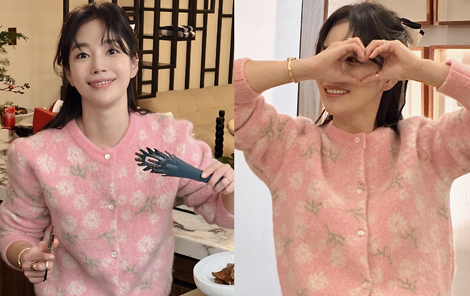 그녀가 착용한 가디건은 러블리한 핑크 컬러에 플라워 패턴이 돋보이는 크롭 기장감의 라운드 가디건으로, 유니크한 디자인과 아름다운 색감 덕분에 가을과 겨울철에 포인트를 줄 수 있는 아이템으로 주목받고 있습니다.