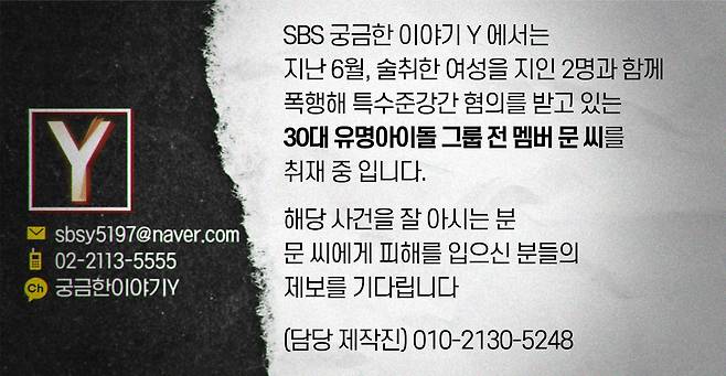 '궁금한 이야기 Y' 팀은 공식 계정을 통해 "지난 6월, 술취한 여성을 지인 2명과 함께 폭행해 특수준강간 혐의를 받고 있는 30대 유명 아이돌 그룹 전 멤버 문 씨를 취재 중 입니다. 해당 사건을 잘 아시는 분 문 씨에게 피해를 입으신 분들의 제보를 기다립니다"고 전했다.