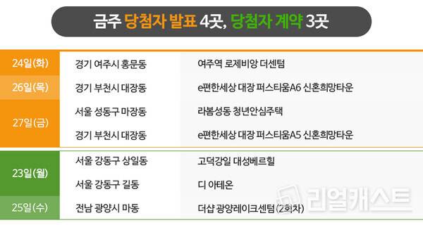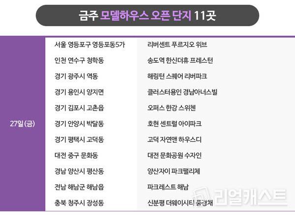 이외에 경기 용인시 '클러스터용인 경남아너스빌', 김포시 '오퍼스 한강 스위첸', 안양시 '호현 센트럴 아이파크', 평택시 '고덕 자연앤 하우스디', 전남 해남군 '파크레스트 해남', 충북 청주시 '신분평 더웨이시티 풍경채' 아파트 모델하우스가 오픈 될 예정입니다.
