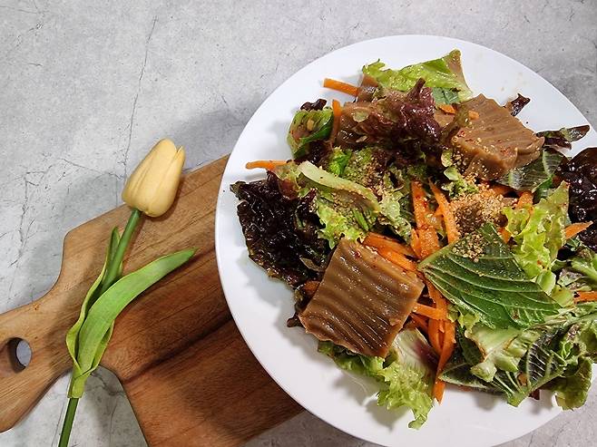 이 양념은 도토리묵 없이 상추 샐러드로만 먹어도 훌륭한 한 끼가 됩니다