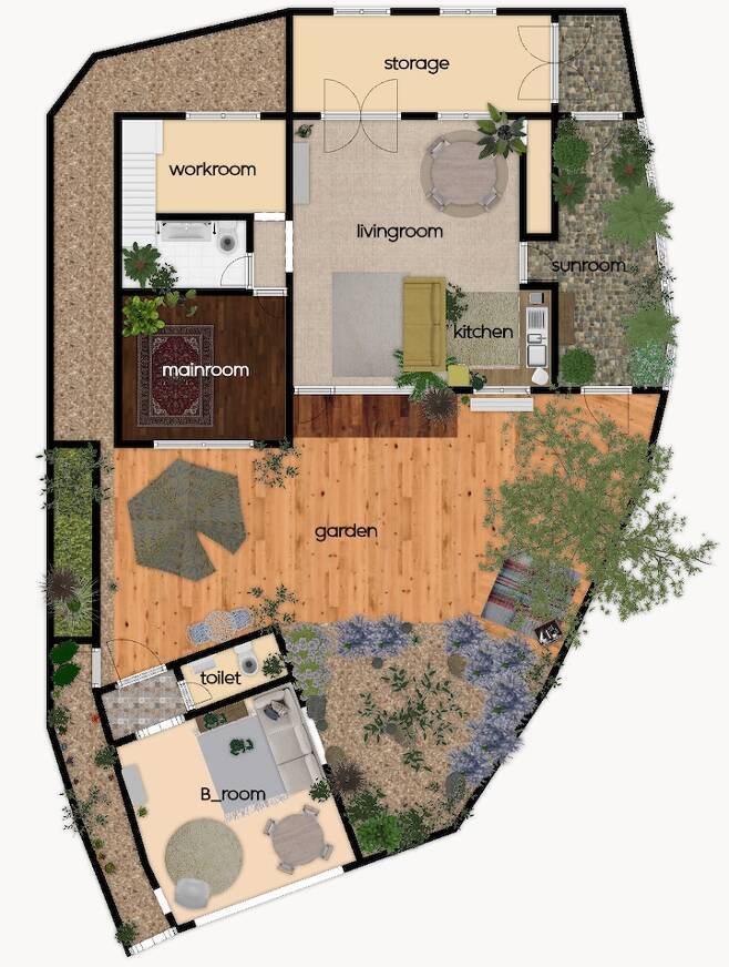 도면 열심히 그려봤어요 :) 중앙에 마당을 두고 본채와 별채로 이루어진 단층 주택이에요.