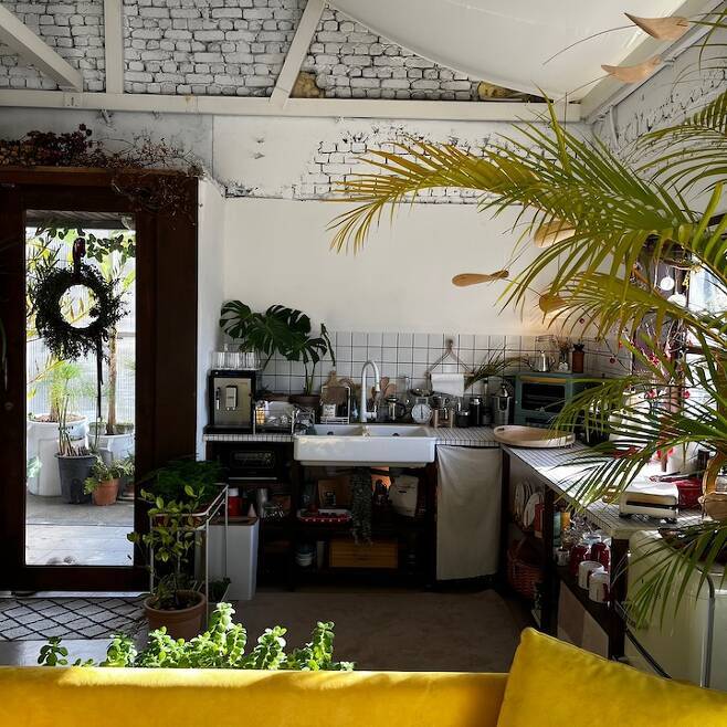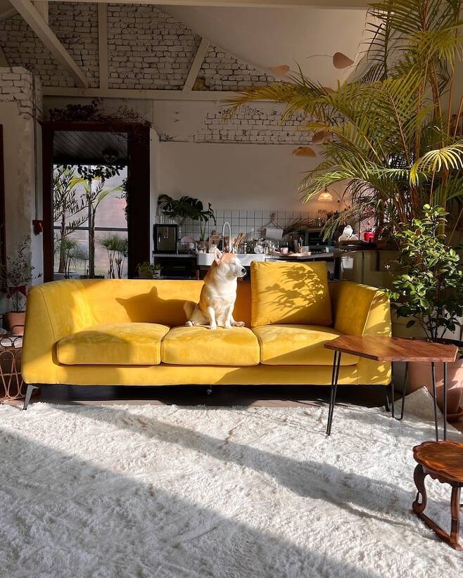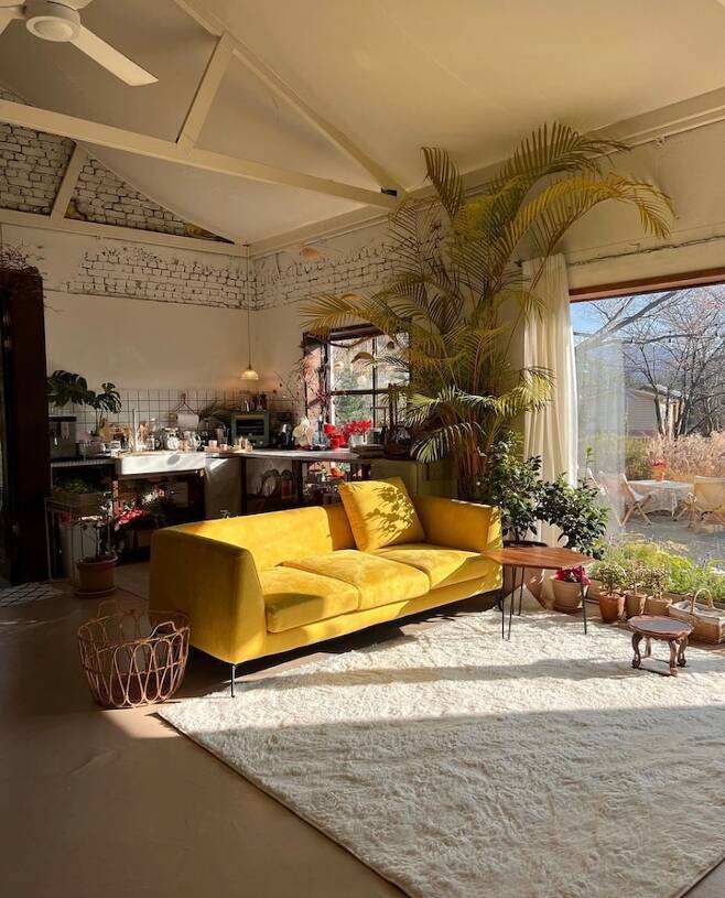 부엌과 거실 사이에 노란 소파를 파티션 삼아 공간을 분리했는데, 높이가 낮아 갑갑하지 않으면서도 내추럴한 무드의 공간에 컬러 포인트가 되어 좋아요.