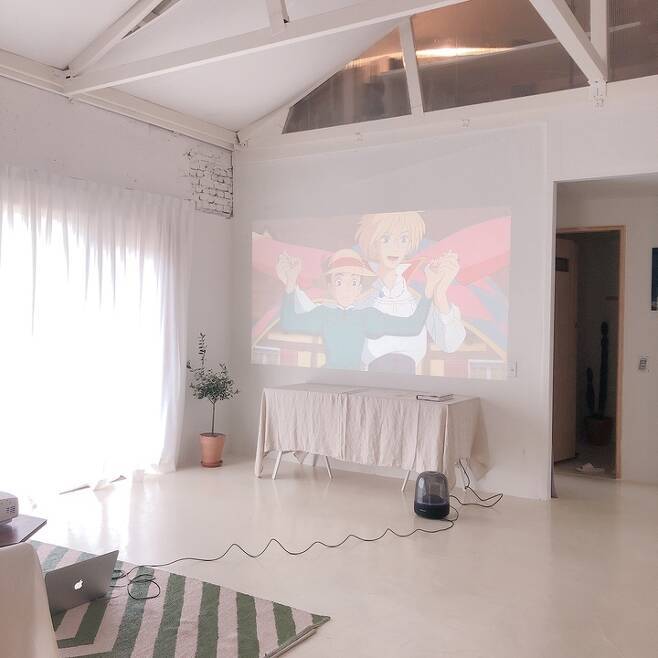 이제 거실 한 바퀴를 다 돌았네요. 통창 옆 소파 맞은편 벽은 깨끗한 화이트 벽으로 두고 영화를 보기도 하고 촬영할 때 배경으로 쓰고 있어요.