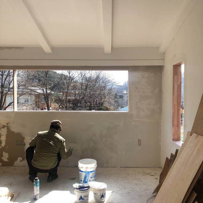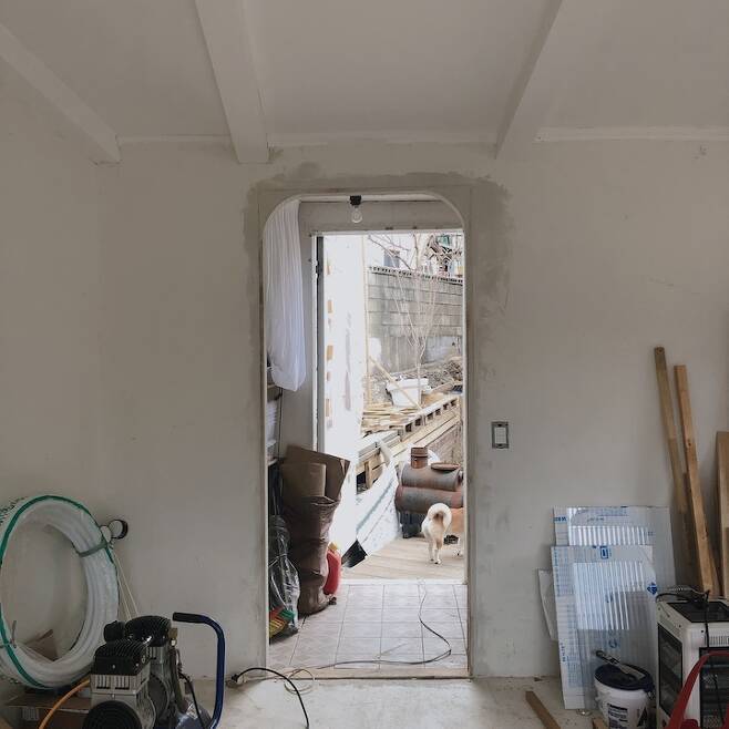 공사 중간중간 찍었던 사진들이에요. 문도 뚫고 창문도 뚫고 아치 문틀도 만들고 외벽 페인팅, 내부 페인팅, 바닥 에폭시, 화장실 대공사까지. 한창 예쁘던 봄날, 매일 공사의 연속이었어요.