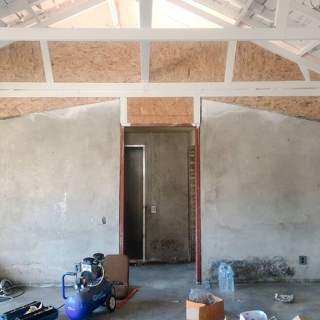 기존 천장을 걷어낸 후 박공형 지붕을 그대로 살리고 벽을 트면서 기둥이 사라진 천장을 받치기 위해 철제 빔으로 보강작업을 했어요.(업체)
