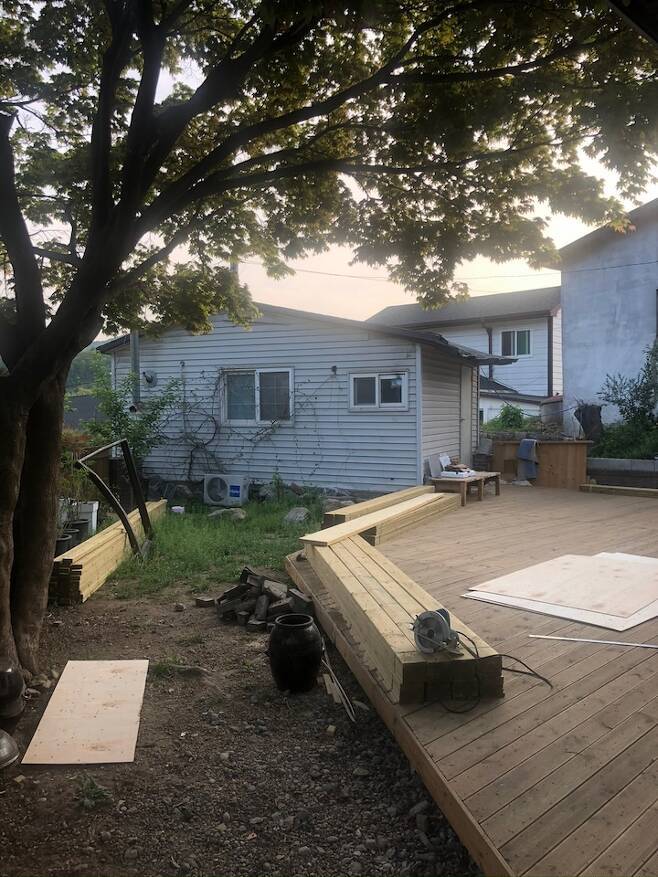 아주 오래전, 잔디밭이었던 마당은 키우던 리트리버 두 마리가 깽판을 친 다음 완전히 망가지고 그 후 황무지로 지냈었는데 이번에 데크를 깔고 관리하기 좋은 면적만 남겨서 정원을 만들었어요.