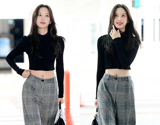 또, 문가영은 블랙 체크 패턴의 와이드 팬츠를 매치해 스타일리시하고 멋스러운 코디를 완성했습니다.