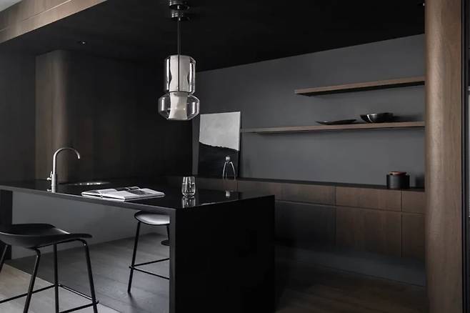 현관과 거실 사이에 위치한 바 공간은 방문객을 환영하는 주요 포인트다. 짙은 갈색의 무늬목으로 감싼 기둥과 철회색 벽이 어우러져 따뜻하면서도 세련된 분위기를 조성한다.
