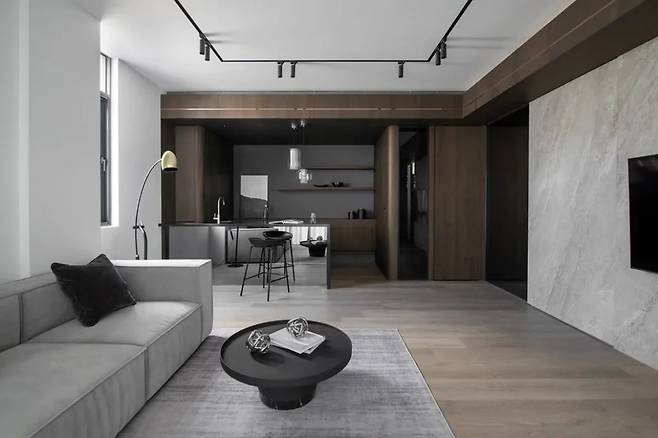 새로 결혼한 부부가 설계한 1층의 거실은 편안함과 세련된 미니멀리즘을 동시에 느낄 수 있는 공간이다. 전체 바닥은 따뜻한 색조의 내구성 강한 원목 마루로 마감되었고, 벽은 회색 계통의 석재 느낌 얇은 패널로 마감되어 시선을 끈다.