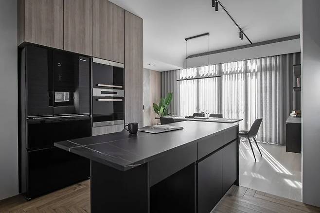 창을 향해 배치된 조리대는 조리와 세척의 동선을 최소화했으며, 옆의 아일랜드는 조리 작업대와 수납 공간으로 활용된다. 전자기기는 가까운 위치에 배치되어 동선이 간결하고 조리가 효율적이다.