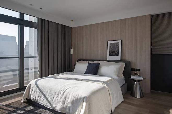 주인의 개성이 드러나는 침실은 기둥을 감싸는 나무 마감이 침대 헤드보드까지 이어져 안정감을 제공한다. 창문 앞에는 따뜻한 햇빛과 어우러지는 클래식 그레이 계열의 암막 커튼이 설치되어 하루를 편안하게 마무리할 수 있다.