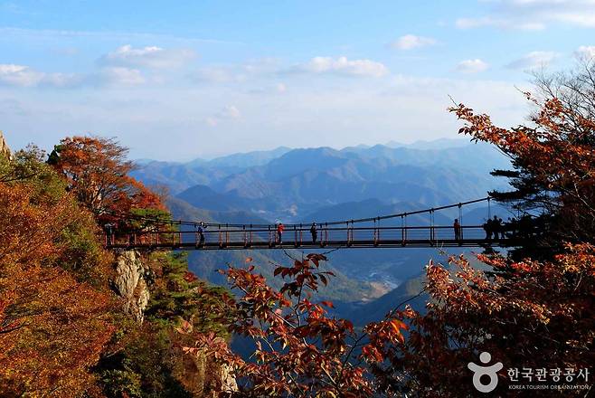 대둔산 산행의 백미는 정상 부근에 위치한 구름다리입니다. 절벽 사이를 연결한 이 다리는 아찔함과 함께 시야를 압도하는 풍경을 선사하며, 산행의 하이라이트로 꼽힙니다. 구름다리를 건너면 약수정이 나오고, 삼선계단을 지나 왕관바위까지 이어지는 코스가 기다립니다.
