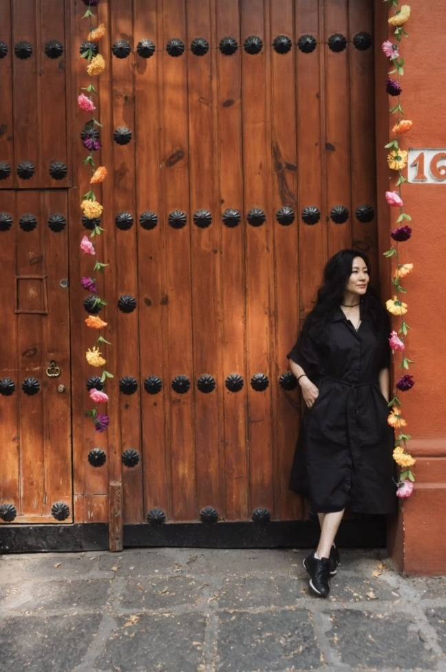 블랙 트렌치코트를 매치해 한층 깊이 있는 무드를 더했으며, 배경과 어우러지는 시크한 감성이 돋보이는 스타일을 완성했습니다.