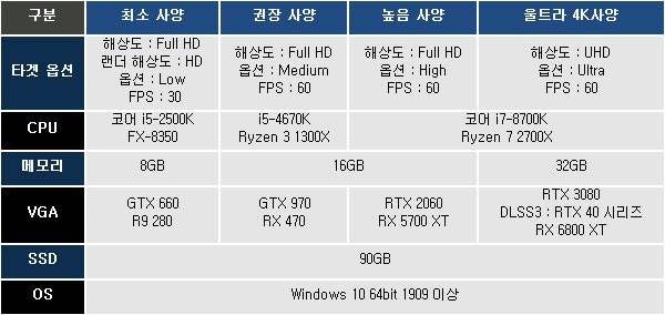 공식 요구사양에 따르면, 다행히 울트라 4K 사양을 제외한 가장 높은 사양을 요구하는 '높음 사양'도 최신 시스템 기준으로는 메인스트림급 부품으로 구성되어 있다.