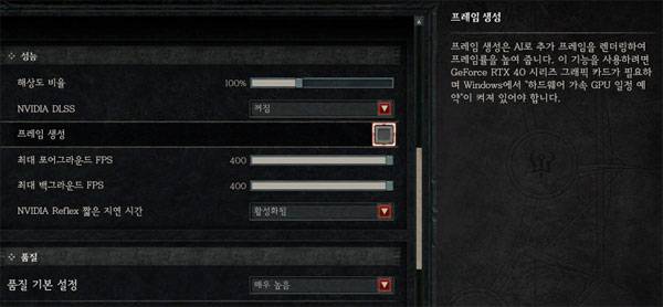 지포스 RTX 4070은 UHD 네이티브 해상도에서 약 80프레임의 성능을, DLSS 3 균형 옵션 적용시 약 130프레임에 달하는 성능을 내준다. 이정도면 최고 옵션으로도 월드 보스 레이드나 '런' 플레이에도 크게 부족하지 않은 성능일 것이다.
