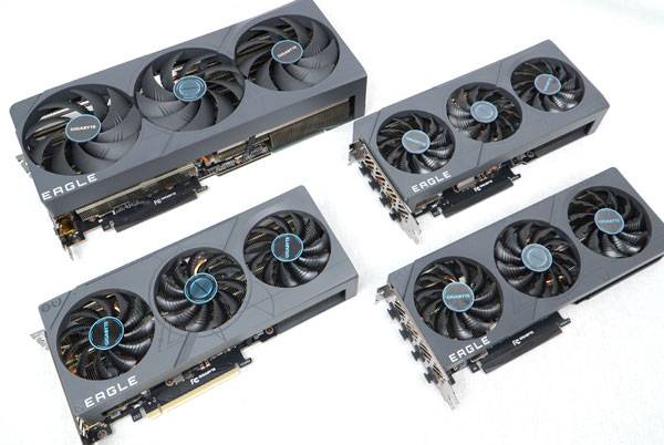 테스트 제품들은 모두 가볍게 오버클럭된 가성비 라인업인 '이글' 시리즈로, 테스트 제품들 모두 기가바이트 고유의 윈드포스 기반 쿨링 시스템이 작용되었다. 특정 온도 기준 쿨링팬의 동작을 On/ Off해 냉각 성능과 쿨링팬 수명, 소음의 균형을 잡은 3D 액티브 팬 설계, 트리플 쿨링팬 중 중앙의 팬 회전 방향을 양 측면의 팬과 다른 방향으로 설정해 경계면의 난류를 최소화해 냉각 성능을 높인 얼터네이트 팬 디자인이 적용되었다.