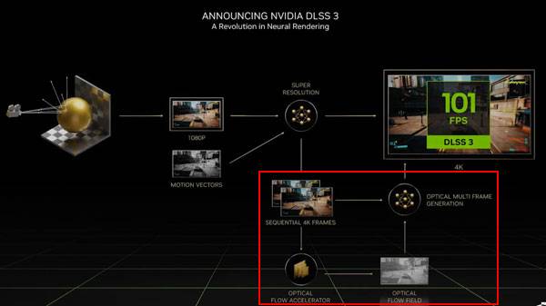 DLSS 3는 DLSS 2 를 기반으로 AI로 생성한 프레임을 추가해 성능을 올려주는 기능으로, 프레임 보간 과정에서 성능과 품질을 유지하기 위한 전용 로직이 들어간 지포스 RTX 40 시리즈부터 지원한다.