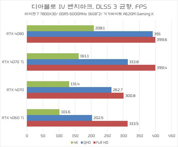 DLSS3를 켜자 RTX 4070 Ti도 Full HD에서는 디아블로 IV의 최대 프레임인 400에 달하는 평균 프레임급 성능을 내줬고, 다른 그래픽 카드들 역시 상당한 성능 향상을 경험할 수 있었다.