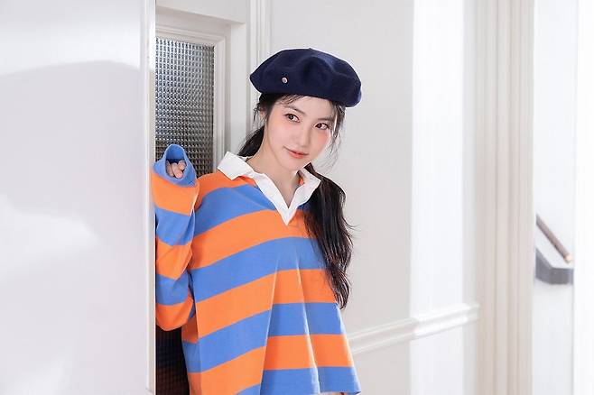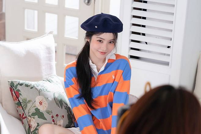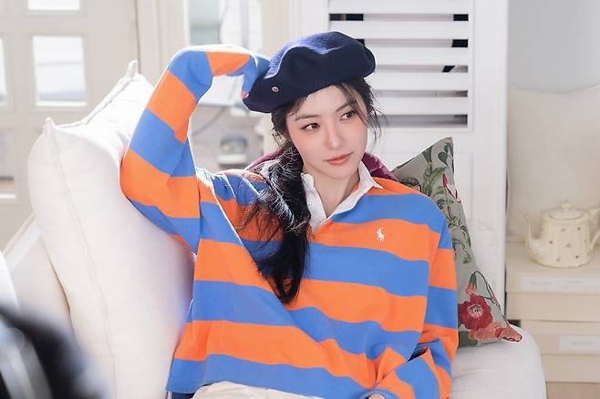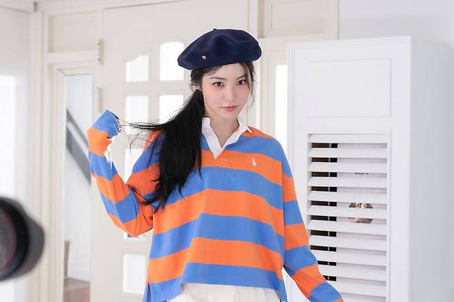신예은 베레모에 폴로랄프로렌 럭비 셔츠를