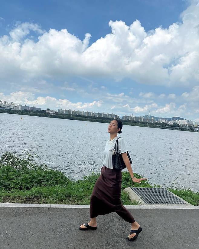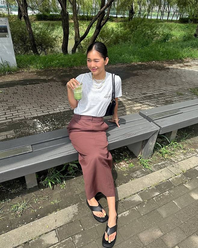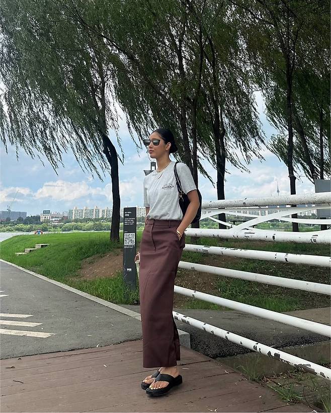 누구나 옷장에 하나쯤 있을 법한 화이트 티셔츠에 차분한 브라운 롱스커트를 매치했다.