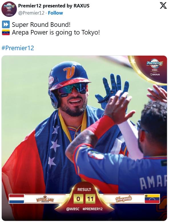 베네수엘라는 15일(이하 한국 시간) 멕시코 할리스코주 과달라하라의 에스타디오 파나메리카노에서 열린 2024 WBSC 프리미어12 A조 조별리그 네덜란드와 경기서 11-0으로 7회 콜드게임 승리를 거뒀다. 4승 1패를 기록한 베네수엘라는 각 조에서 상위 2팀만 출전하는 슈퍼라운드(4강) 진출을 가장 먼저 확정했다.