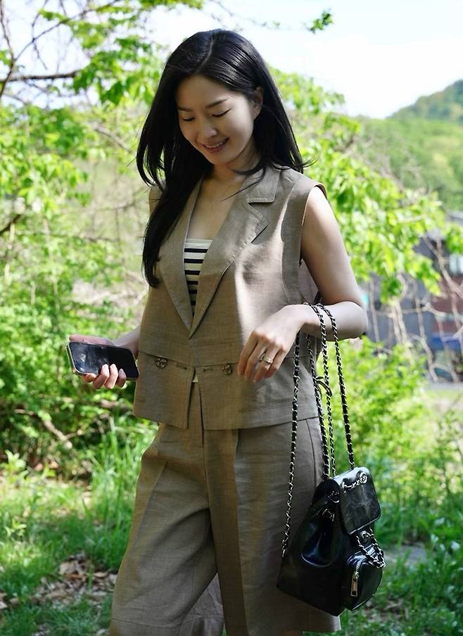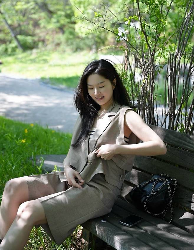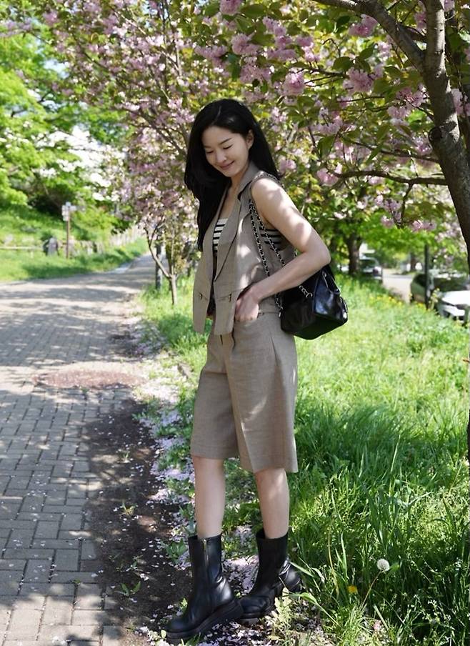 공개한 사진에서 류이서는 베이지 반바지 팬츠와 스트라이프 민소매 티셔츠 위에 베이지 베스트 재킷을 걸친 반바지 조끼 슈트룩으로 여름 멋쟁이로 변신했다.