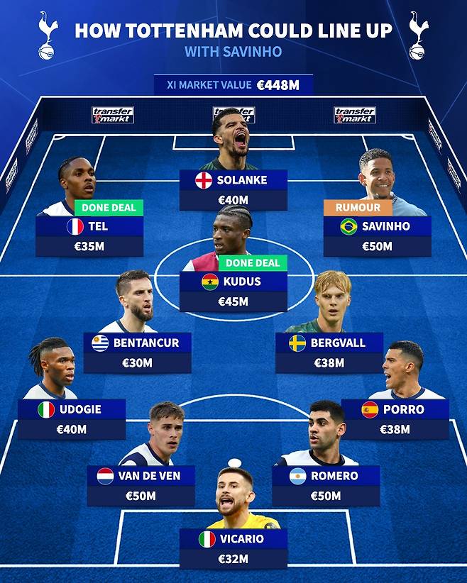 ‘트랜스퍼마르크트’가 예상한 2025-26시즌 토트넘 선발 라인업의 가치는 상당했다. 11명 모두 합산해 4억 4,800만 유로(약 7,231억 원) 가치를 지녔다. 과연 토트넘이 원하는 영입을 이뤄 다가오는 시즌 유럽축구연맹(UEFA) 유로파리그(UEL) 우승 영광을 이어갈 수 있을까.
