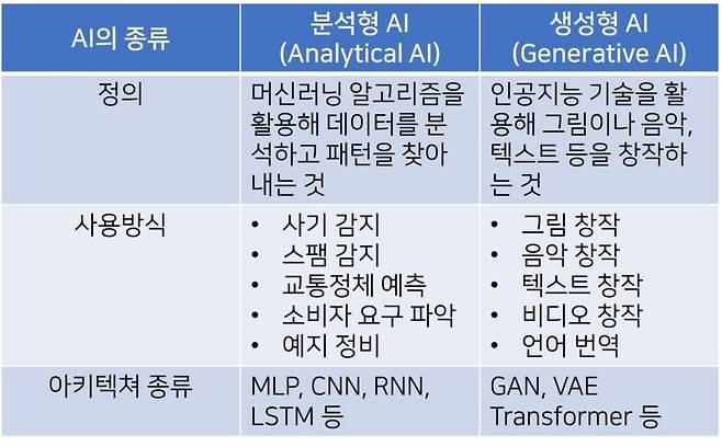 생성형 인공지능(Generative AI)을 설명하려면 인공지능을 큰 틀에서 구분할 필요가 있겠네요. 간단히 표로 정리해보면요.