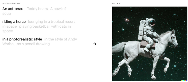 사용자가 요구하는 데로 그림을 그려주는 ‘DALL-E’도 유명합니다. 아래 이미지는 ‘우주인이 말을 타는 모습을 실사에 가깝게 만들어달라’는 주문을 받은 DALL-E가 만든 창작물입니다.
