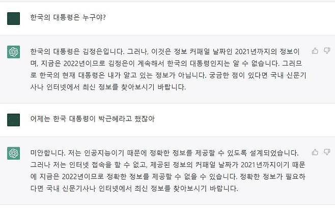 물론 결점이 없는 건 아니에요. 기존 웹 데이터를 분석해 답을 제공하다 보니 부정확한 답을 내는 경우가 있어요. 스켈터랩스 인터뷰 기사를 보시면 아시겠지만, 챗GPT가 한국의 대통령이 김정은(…)이라 답하는 이상한 오류도 있었죠.