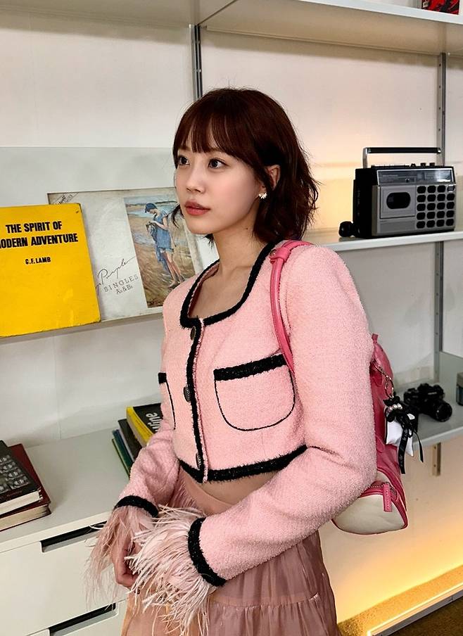 공개한 사진에서 허영지는 복근을 살짝 드러낸 크롭 핑크 트위드 재킷과 풍성한 핑크 러플 미니 스커트의 핑크룩으로 사랑스러운 인형미모를 드러냈다.