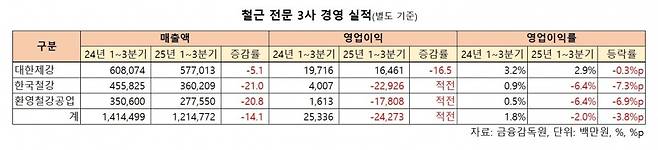 반면 한국철강과 환영철강공업의 경우 올 1~3분기 20%대의 매출 급감과 함께 각각 229억원, 178억원의 대규모 영업손실을 기록했다.