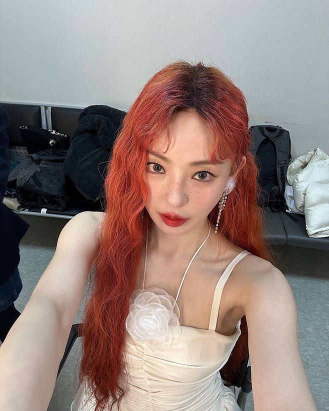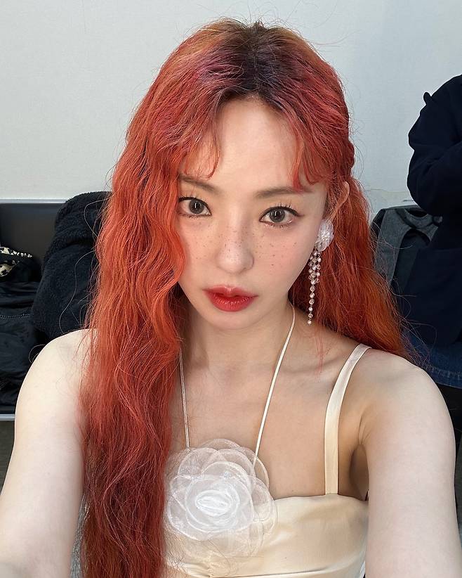 이번 헤어스타일의 핵심은 시선을 압도하는 선명한 오렌지 레드 컬러와 촘촘한 물결 웨이브에 있어요.