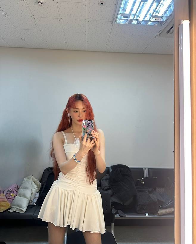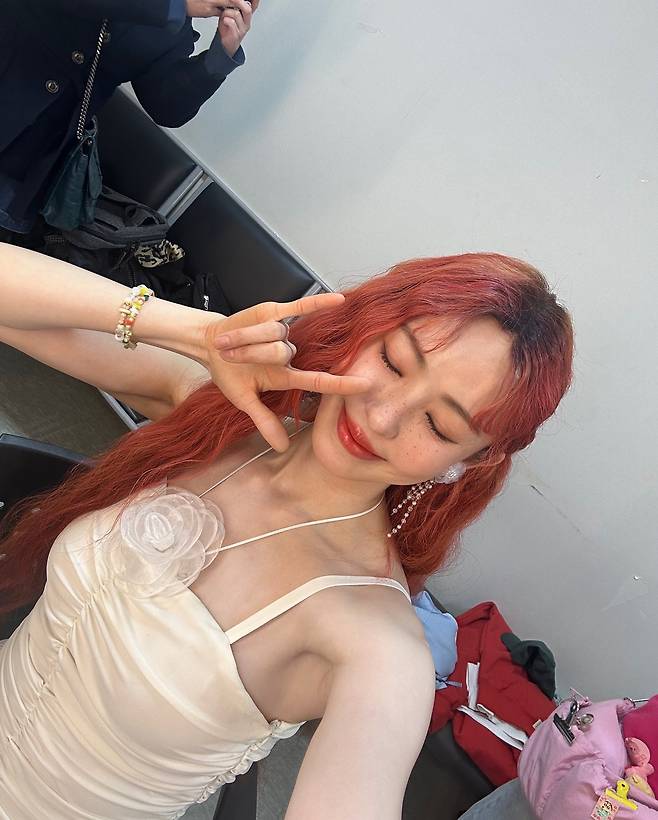 한쪽 귀 뒤로 머리카락을 넘겨 드러낸 화려한 드롭 이어링은 강렬한 헤어 컬러와 대비되어 세련된 세트장 분위기를 자아내요.