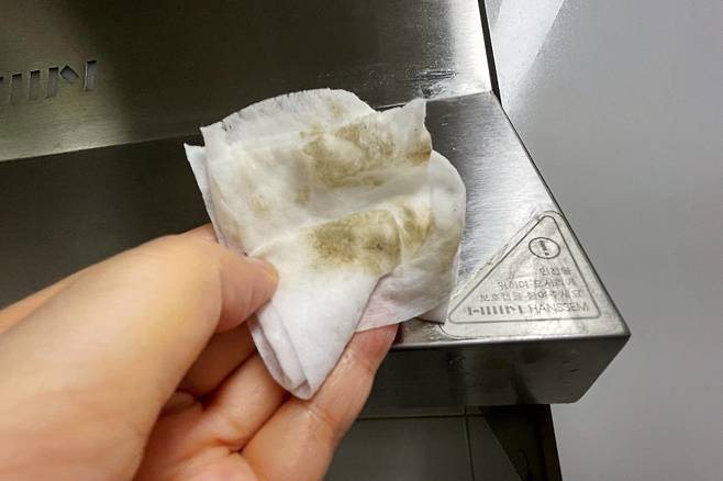 바로 가스후드인데요. 안 쓰는 손소독제를 넉넉히 묻혀준 뒤 물티슈로 닦아보세요. 가스후드에 기름때, 찌뜬때 제거하는데 참 좋답니다.